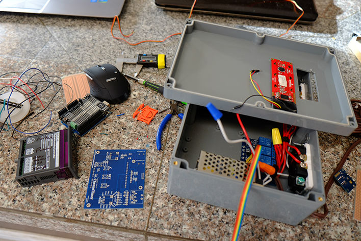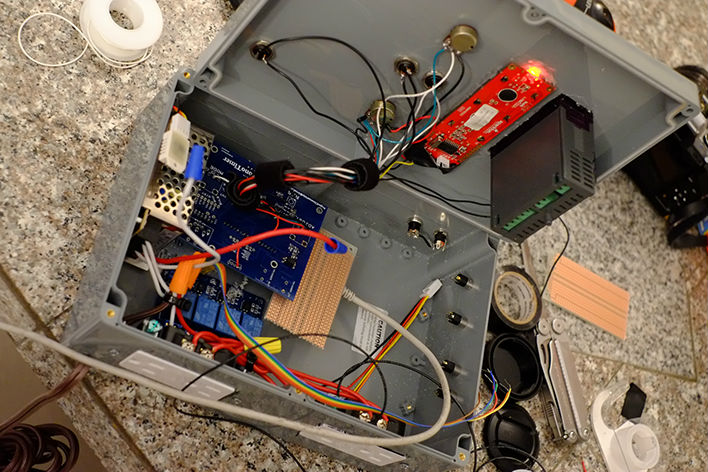 In the image you can see the AC-12VDC converter, the 4 relays, the outlets, and jacks.