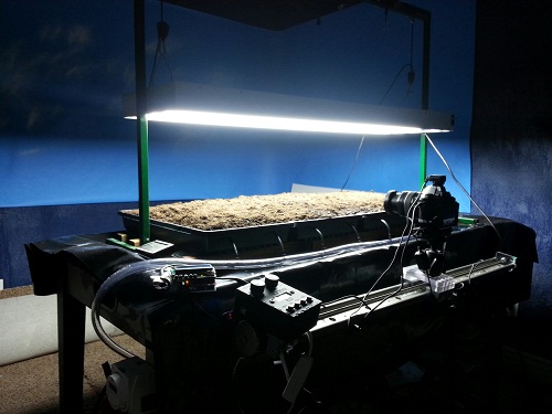 11/13/2o13 Unfortunately things do not always go according to plan, and often problems like to bring friends. I came home yesterday and checked on the timelapse progress, only to find the water return line had skipped from its clamp and instead of dumping the excess water into the water bucket, it was dumping it on the carpet. Luckily it appears that i only dumped a gallon or so of water onto the carpet. I shut off the watering system, used towels to absorb as much water as I could then put out a high powered fan to dry the remaining water. I had a bowl of wheat grass seeds soaking the last few days and set the camera up to take some images of the wheat grass growing from seedling to sprout. I checked on it few hours later to see FLASH FLASH FLASH coming from the room. Somehow the camera was just triggering every second or so as its buffer cleared. I spent some time troubleshooting, but i had to basically put everything on hold for a little while. Plugged in Chronocontroller -half press results in metering. camera only triggers on full press. Plugged in Greenthumb -Camera triggers with half press. Plugged in Greenthumb plus hotshoe adapter with PC sync to the Strobe and plugged into the strobe it triggers non stop. So what does all this mean? It seems I have a wiring issue on Geenthumb. If i put the chronocontroller between greenthumb and the camera i do not have this problem. I will be building another Greenthumb controller this weekend so i can use one while i develop more capability on the other, and hopefully i will be able to clear this problem. This is sort of how things go… sometimes everything works flawlessly, other times you rack up 3,000 shutter actuations and a gallon of water in your carpet. Here is one of the clips that i just finished before the problems started. no audio, very raw.